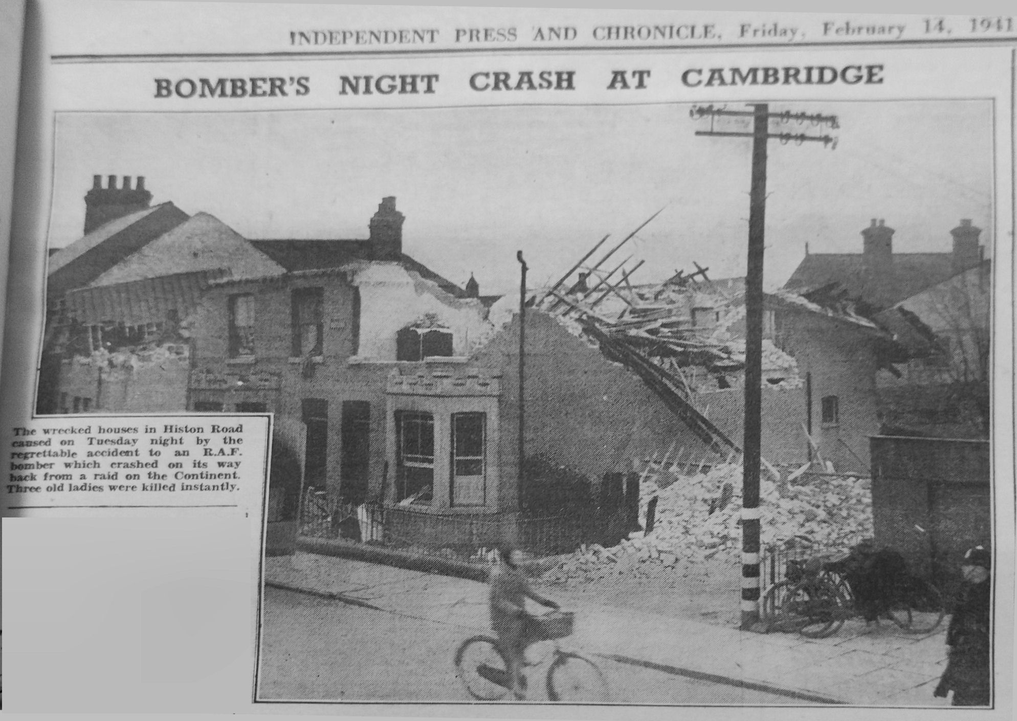 | Extract from Cambridge Daily News in 1941: BOMBER'S