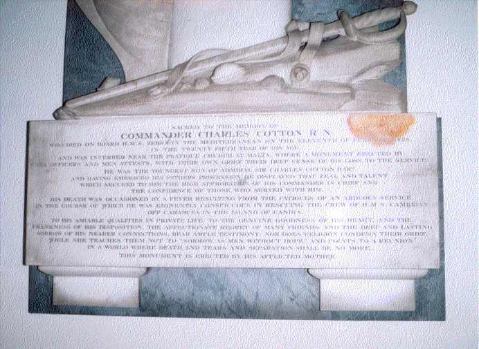 "Commander Charles Cotton R.N. Died on board HMS Zebra in the Mediterranean on the 11th February 1828 aged 25 years. Interred near the Pratique Church at Malta, where a monument erected by his officers and men attest ........ His death was occasioned by a fever resulting from the fatigue of an arduous service in the course of which he was eminently conspicuous in rescuing the crew of HMS Cambrian off Carabusa in the Island of Candia". Son of Sir Charles (see below).