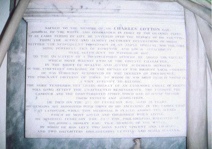 "Sacred to the memory of Sir Charles Cotton Bar T, Admiral of the White Fleet. At an early period of his life he entered into the service of his country. From the active and almost incessant occupations of which neither the subsequent possession of an ample fortune, nor the still more powerful ties of domestic and local attachment were sufficient to withdraw him".