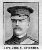 From de Ruvigny's The Roll of Honour, part 1, page 74: CAVENDISH, LORD JOHN SPENCER, D.S.O., Major, 1st Life Guards, brother of Victor, 9th Duke of Devonshire, P.C., G.C.V.O., 3rd a. of the late Lord Edward Cavendish, M.P., by his wife, Emma Elizabeth (6, Carlos Place, W.), dau. of the Right Hon. the Hon. William Sebright Lascelles, P.C., and grandau. of Henry. 3rd Earl of Harewood; b. 25 March, 1875; and was educ. at Eton and Trinity College, Cambridge. After serving in the Militia he was given a commission in the 1st Life Guards, 3 Feb. 1897, and was promoted Lieut. 2 April, 1898, Capt. 23 Aug. 1902, and Major 12 April, 1911. He served with distinction on the Staff in t.he South African War 1899-1906, being divisional Signalling Officer to the 2nd Infantry Division 9 Oct. 1899 to 18 June, 1900, and Brigade Signalling Officer, 19 June to 12 Oct. 1900; took part in the relief of Ladysmith, including action at Colenso ; operations of 17 to 24 Jan. 1900 ; and action 4t Spion Kop ; the operations of 5 to 7 Feb. 1900, and action at Vaal Kranz; the operations on Tugela Heights (14 to 27 Feb.); the engagement at Pieter’s Hill; and the subsequent march from Bloemfontein to Pretoria; Including actions at Zand River, near Johannesburg, Pretoria and Diamond Hill (11 to 12 June), also in the Transveal west of Pretoria; actions at Eland’s River (4 to 16 Aug.) and in the Orange Free State, actions at Bethlehem (7 July) and Wittebergen (15 to 29 July). His services were mentioned in Despatches ondon Gazette, 1 Feb 1901] and he was awarded the Distinguished Service Order and the Queen’s medal with six clasps. He was employed with the West African Frontier Force, 29 June, 1907, to 6 Sept. 1910. After his brother's succession to the title he was granted precedence as son of a Duke of Royal Warrant, Nov. 1908. On the outbreak of the European War he went to France with the Expeditionary Force and was killed in action 20 Oct. 1914: unm. |