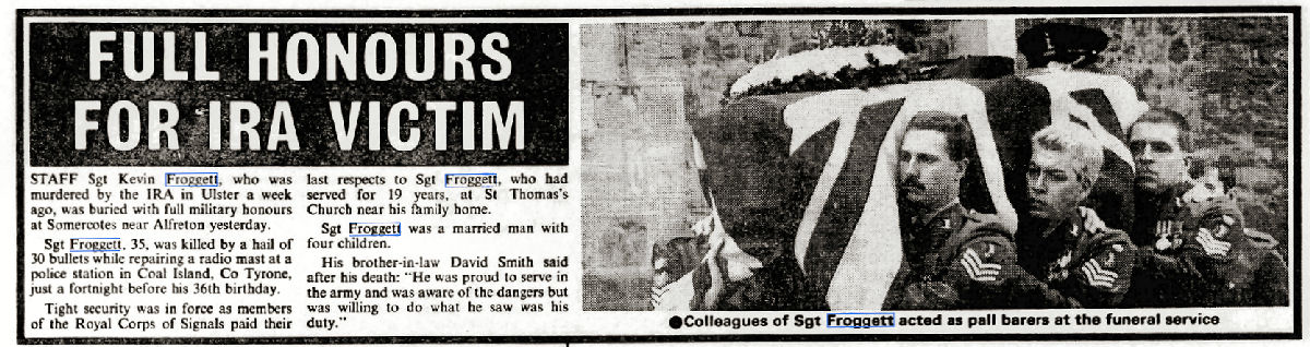 | FROGGETT | Kevin Arthur | Staff Sergeant 24195666, Royal Corps of Signals. Shot and killed by the IRA as he repaired a radio mast at Coalisland RUC station 16 September 1989. Aged 35. Born 30 September 1953. Buried in BIRCHWOOD METHODIST PLOT, ST. THOMAS CHURCHYARD, Birchwood Lane, Somercotes, Alfreton, Derbyshire. Extract from Ilkeston Express, Belper Express, Ripley Express and Derby Express - Thursday 21 September 1989, page 11: Soldier killed