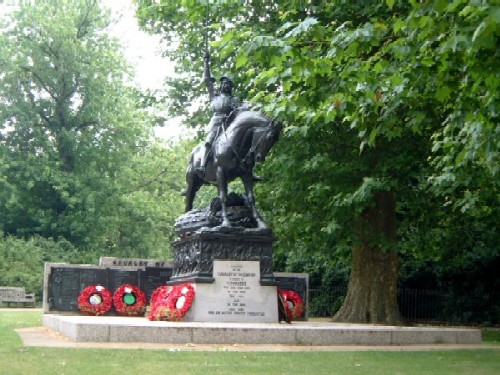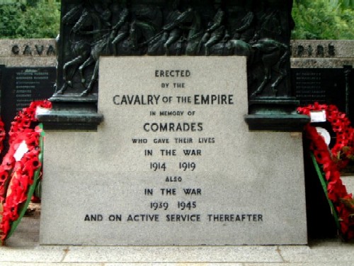 Situated on the corner of Hyde Park nearest Constitution Hill is the Monument to the Cavalry of the Empire showing a fine St George and the Dragon by Adrian Jones (1924). St George has his sword pointing upwards, and his fiery horse steps over the vanquished dragon, which is of the crocodile like. Around the base, a frieze of galloping horsemen. The wall at the rear bears the names of the various cavalry units that served from the countries of the Empire - Britain, Australia, New Zealand and Canada.
