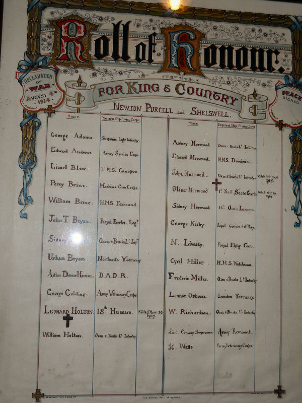 Private 14598, 18th (Queen Mary's Own Royal) Hussars. Killed in action 20 November 1917. Aged 30. Born and resident Buckingham, enlisted London. Son of Mary Holton, of The Post Office, Newton Purcell, Buckingham, and the late Noah Holton. In the 1891 census he was aged 3, born Oxfordshire, a scholar, son of Noah and Mary Holton, resident Shop, Newton Purcell, Bicester, Oxfordshire. In the 1901 census he was aged 13, born Newton Purcell, son Mary Holton (a widow), resident Newton Morrell, Newton Purcell, Bicester, Oxfordshire. No known grave. Commemorated on CAMBRAI MEMORIAL, LOUVERVAL, Nord, France. Panel 1. |