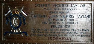 Major, 16th/5th Lancers, Royal Armoured Corps Army no. 42475. He died on 19 February 1943 age 34. He was the son of Captain John Vickris Taylor and Sybil Taylor and the husband of Ruth Prudence Taylor, Walton, Boston Spa, Yorkshire. He is buried in Grave II C 25 Enfidaville War Cemetery, Tunisia. There is also a wooden plaque in the Church